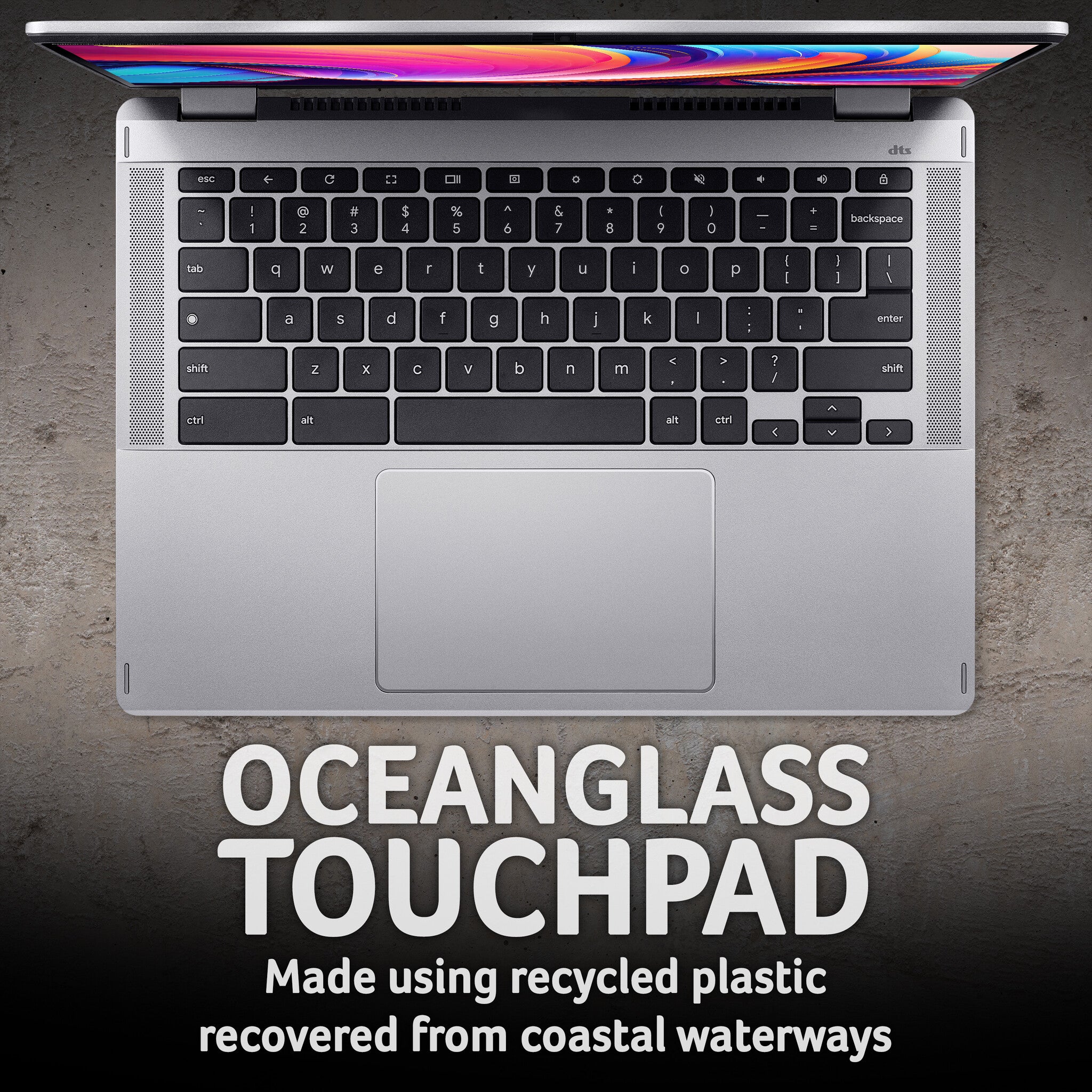 The Chromebook Spin 314 is also designed with sustainability in mind. The trackpad offers a glass-like feel whilst being made from recycled ocean-bound plastic, helping to clean up our seas.