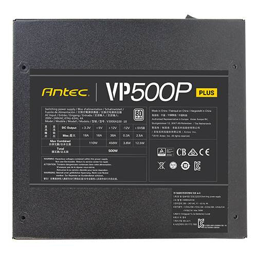 Antec VP500P Plus GB. Total power: 500 W, AC input voltage: 100 - 240 V, AC input frequency: 47 - 63 Hz. Motherboard power connector: 20+4 pin ATX, Motherboard power cable length: 50 cm, SATA power cable length: 500,650,800 mm. Purpose: PC/Server, Power supply unit (PSU) form factor: ATX. Product colour: Black, Cooling type: Active, Fan diameter: 12 cm. Width: 150 mm, Depth: 140 mm, Height: 86 mm