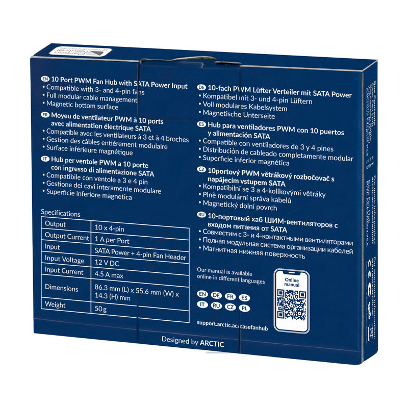 ARCTIC Case Fan Hub - 10 Port PWM Fan Hub with SATA Power. Product colour: Black, Power connector: SATA. Width: 55.6 mm, Depth: 14.3 mm, Height: 86.3 mm. Package width: 55.6 mm, Package depth: 14.3 mm, Package height: 86.3 mm. Cooling agent: Air