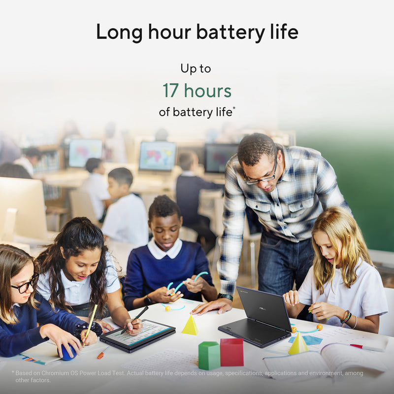 ASUS Chromebook CZ11 Flip stands out as a durable and valuable laptop tailored for K-12 students, with a portable and durable design that guarantees enduring value and empowers engaged learning — anywhere. Featuring a 360°-flippable design and an 11.6-inch display with TÜV-certified technology2, the laptop not only enhances the visual experience but also prioritizes eye protection. The laptop boasts up to 17 hours of battery life3 for uninterrupted use throughout an entire day of classes, empowering students to extend their learning beyond traditional limits.