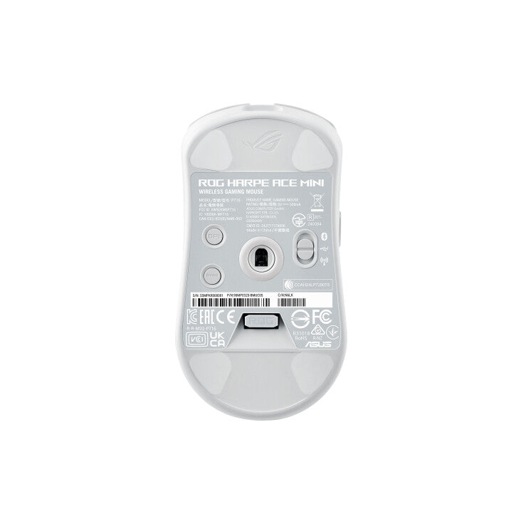 ASUS ROG Harpe Ace Mini. Form factor: Ambidextrous. Movement detection technology: Optical, Device interface: RF Wireless + Bluetooth + USB Type-C, Movement resolution: 42000 DPI, Scroll type: Wheel. Power source: Batteries/Cable. Product colour: White