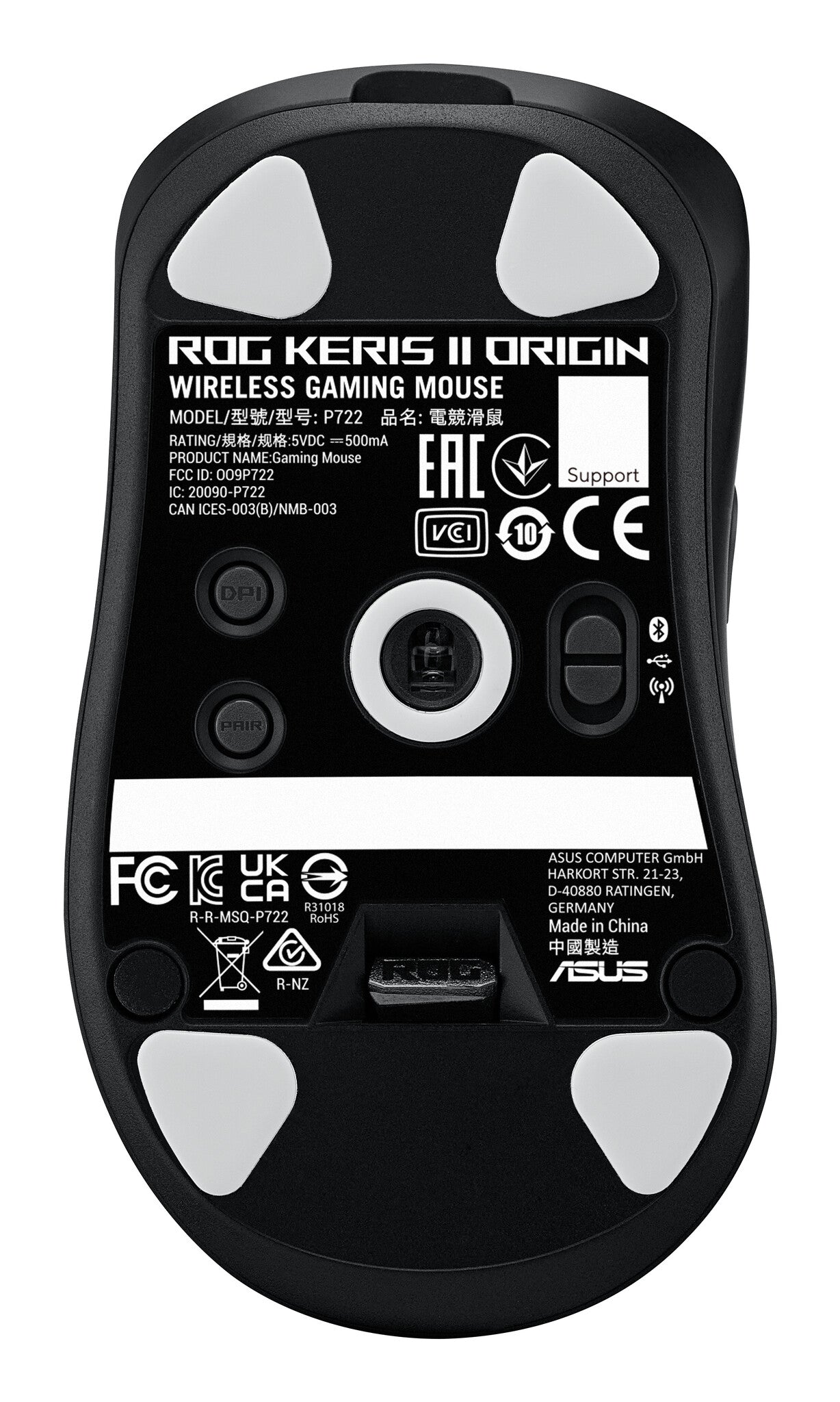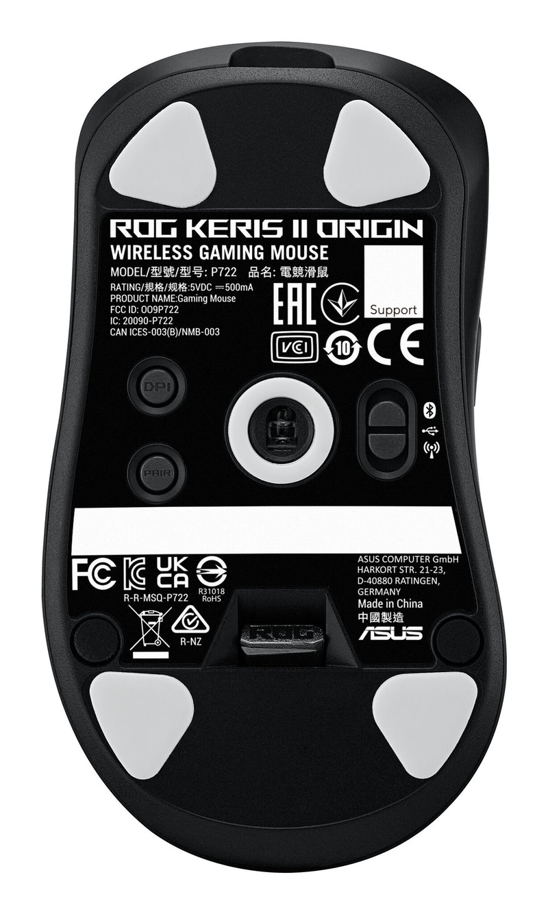 ASUS ROG Keris II Origin BLK. Form factor: Right-hand. Movement detection technology: Optical, Device interface: RF Wireless + Bluetooth + USB Type-A, Movement resolution: 42000 DPI, Buttons type: Pressed buttons, Buttons quantity: 6, Scroll type: Wheel. Illumination colour: Multi. Power source: Batteries/Cable. Product colour: Black