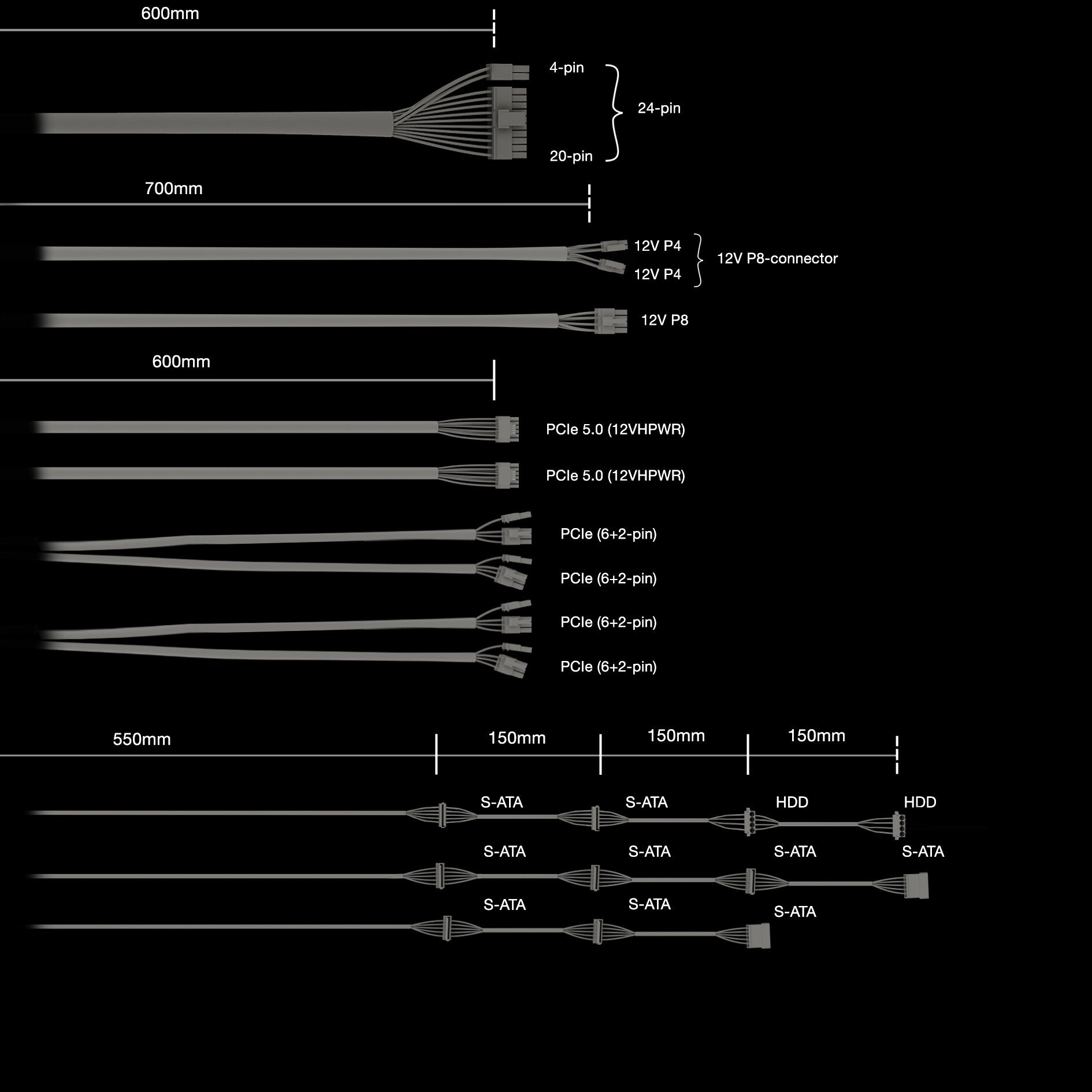 - 2 PCIe 5.0 12VHPWR 600W and 4 PCIe 6+2 connectors for overclocked high-end GPUs