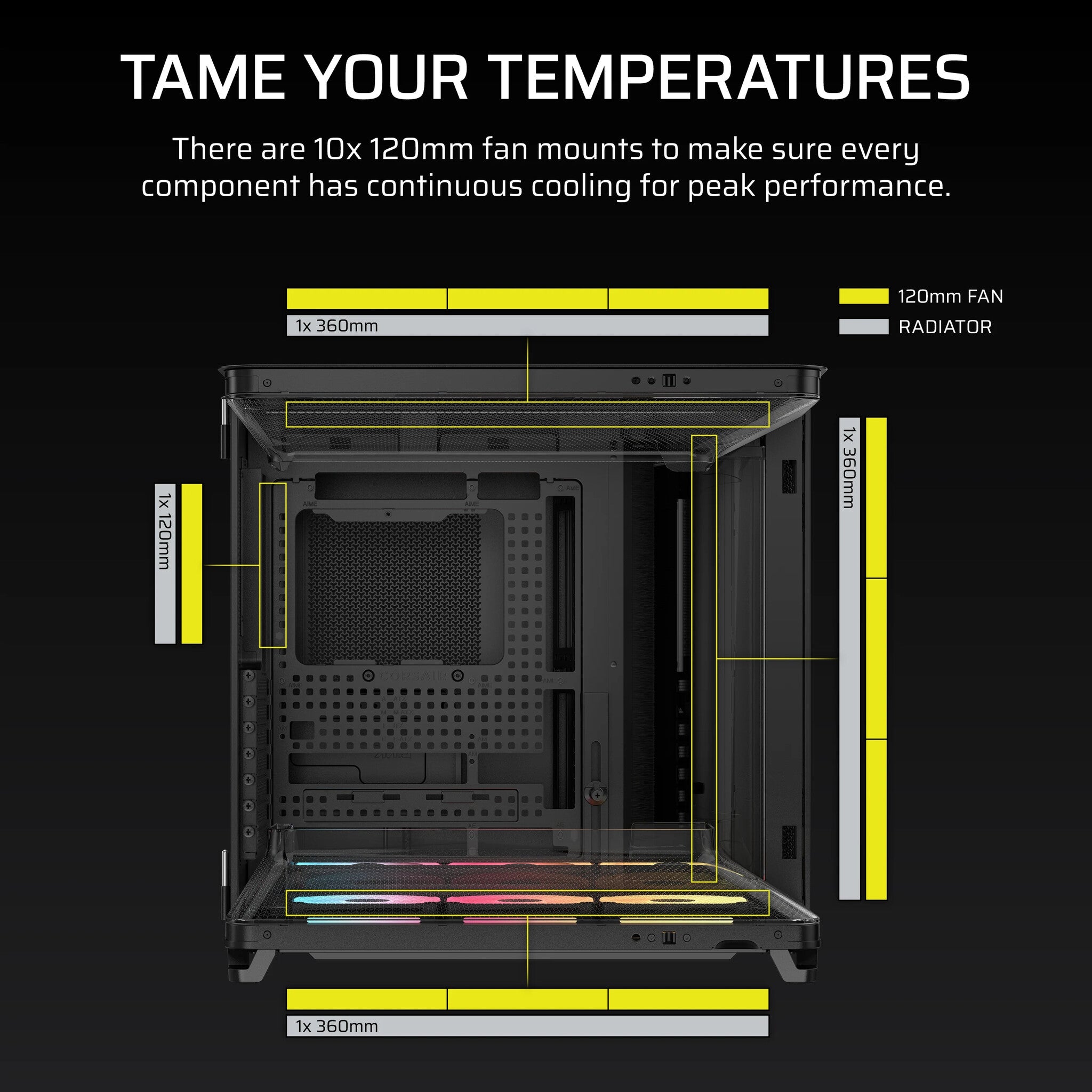 A unique triple-chamber design was created to isolate hot components for effective cooling and maximum performance at all times. Separate chambers for the CPU, GPU/motherboard, and PSU, cables, and storage allow for exceptional thermals and an easy PC building process.