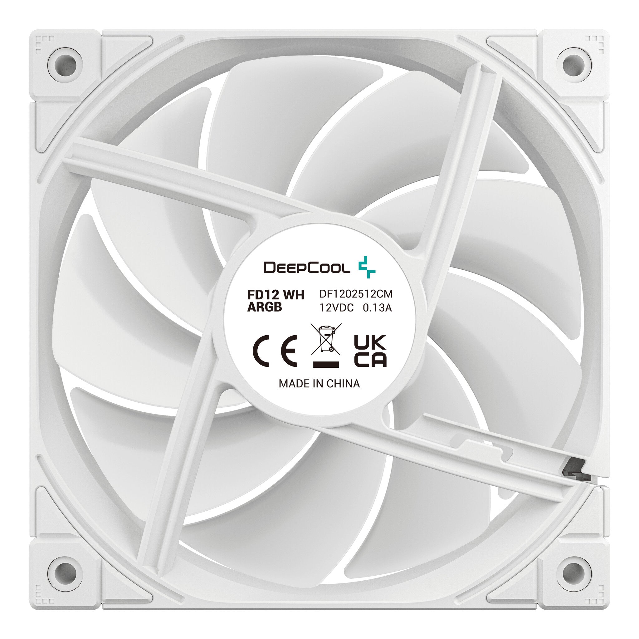 DeepCool FD12 ARGB WH-3 in 1. Type: Fan, Fan diameter: 12 cm, Maximum air pressure: 2.56 mmH2O, Bearing type: Hydraulic. Product colour: White