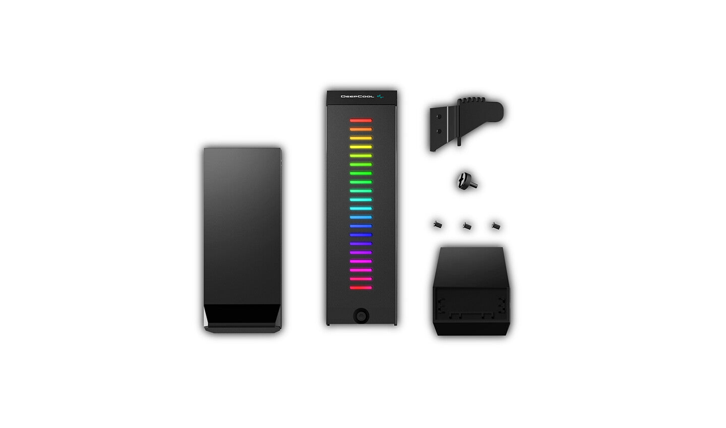 DeepCool GH-01 A-RGB. Compatible chassis type: Full Tower, Type: Graphic card holder, Product colour: Black. Input voltage: 5 V, Power consumption (max): 1.2 W. Cable length: 0.25 m, Width: 52.6 mm, Depth: 60.6 mm. Quantity per pack: 1 pc(s)