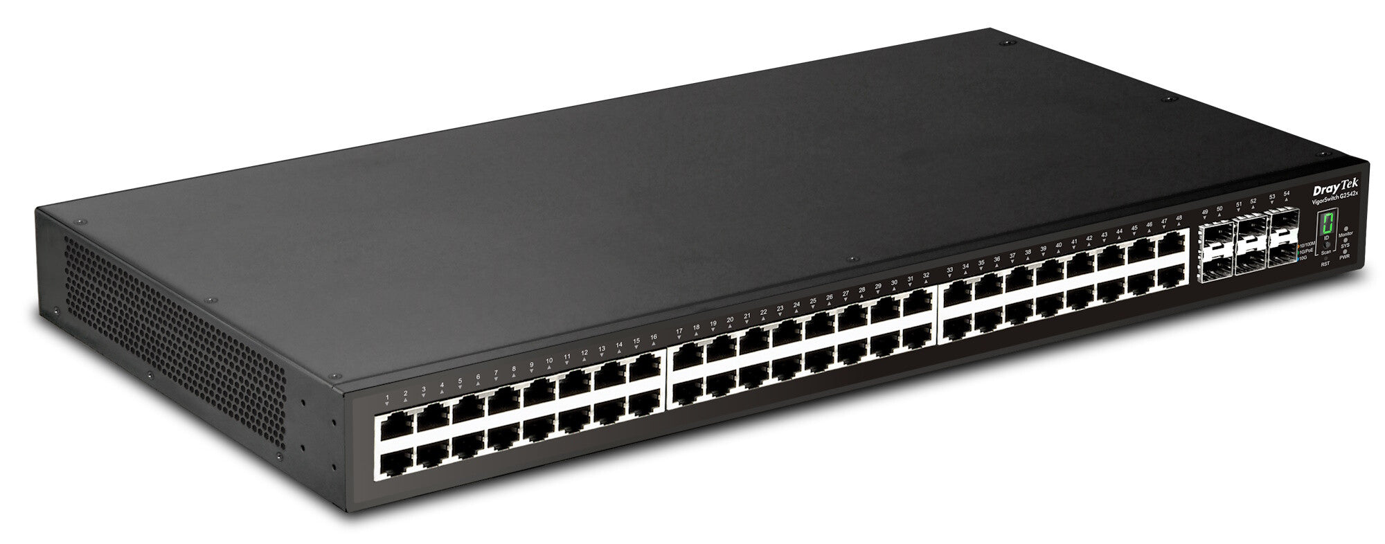 DrayTek VigorSwitch G2542x Managed Switch. Switch type: Managed, Switch layer: L2+. Basic switching RJ-45 Ethernet ports type: Gigabit Ethernet (10/100/1000), Basic switching RJ-45 Ethernet ports quantity: 48, Console port: RJ-45. Full duplex. MAC address table: 32000 entries, Switching capacity: 216 Gbit/s. Power connector: AC/DC. Rack mounting, Form factor: 1U