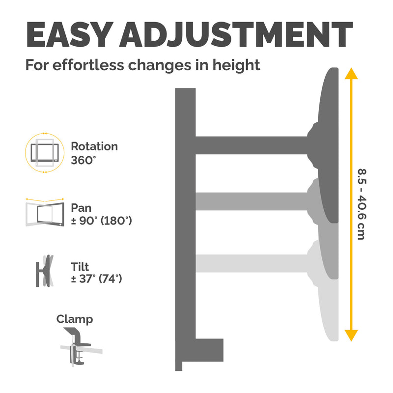 • ADJUSTABLE - This fully independent adjustable monitor arm can pan 180 Degree, tilt +/-37 Degree and can rotate 360 Degree for optimum viewing control