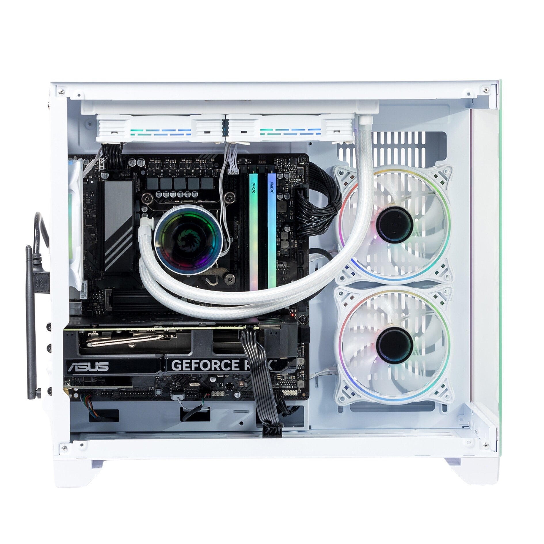 Stylish Case & Cooling: Housed in a sleek white tempered glass case with ARGB support, and cooled by a high-performance white AIO liquid cooler, this system stays cool and quiet even under intense loads.