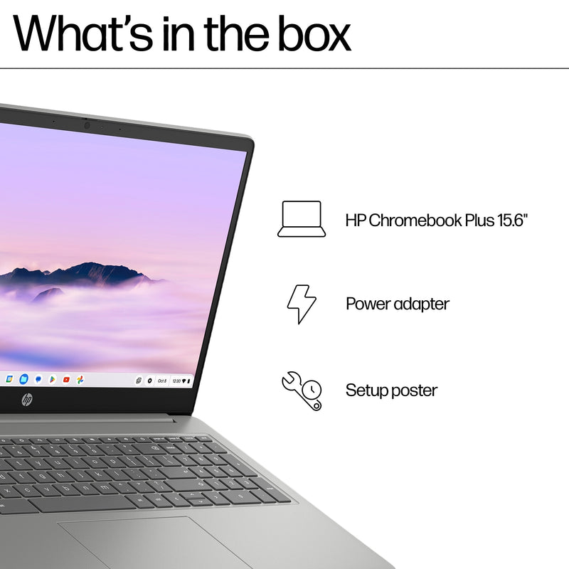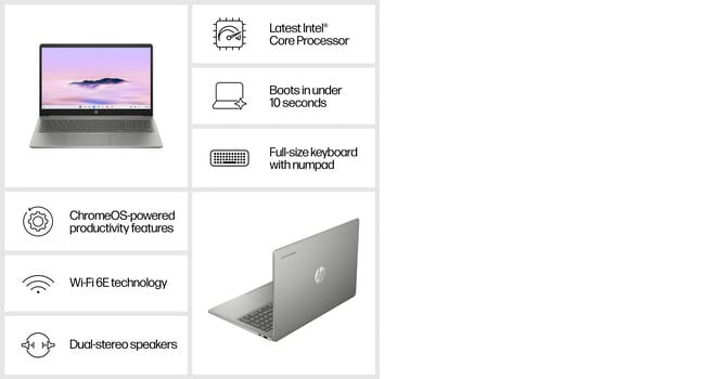 The sleek HP Chromebook Plus delivers prime power for productivity with a full-size keyboard and numpad, 15.6" diagonal screen, fast memory, plus ample storage and up to 13 hours battery life[2]. Stay product with fast bootups, built-in virus protection, the latest Wi-Fi technology, and access to tons of apps in the Google Play Store[7].