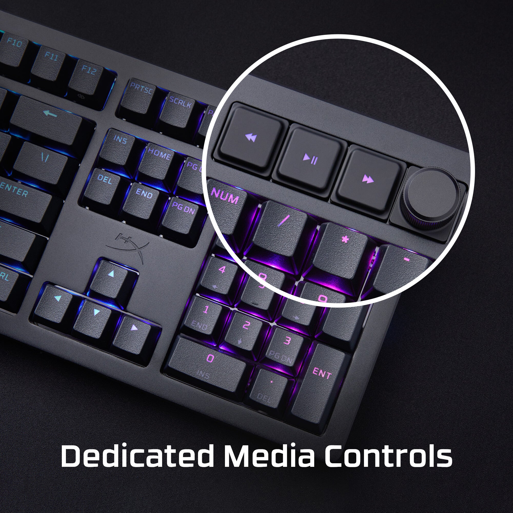- HyperX Linear Switches[3] have a half-wall POM stem for better stability of the preinstalled HyperX PBT Keycaps. They're also factory-lubed for smooth actuation and rated for up to 80 million keypresses[1].