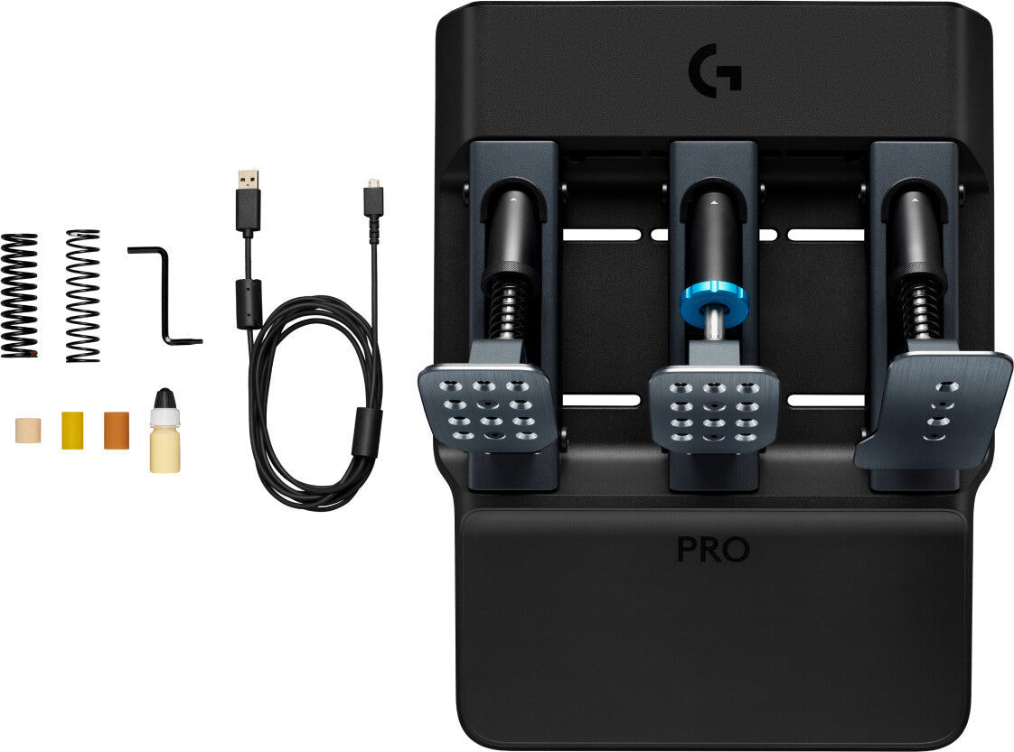 Logitech G G PRO Racing Pedals. Device type: Pedals, Gaming platforms supported: PC, Playstation, Xbox, Gaming control technology: Analogue. Connectivity technology: Wired, Device interface: USB 2.0, USB connector type: USB Type-A. Product colour: Black. Power source: Cable. Pedals dimensions (WxDxH): 341 x 445 x 229 mm, Pedals weight: 5.2 kg