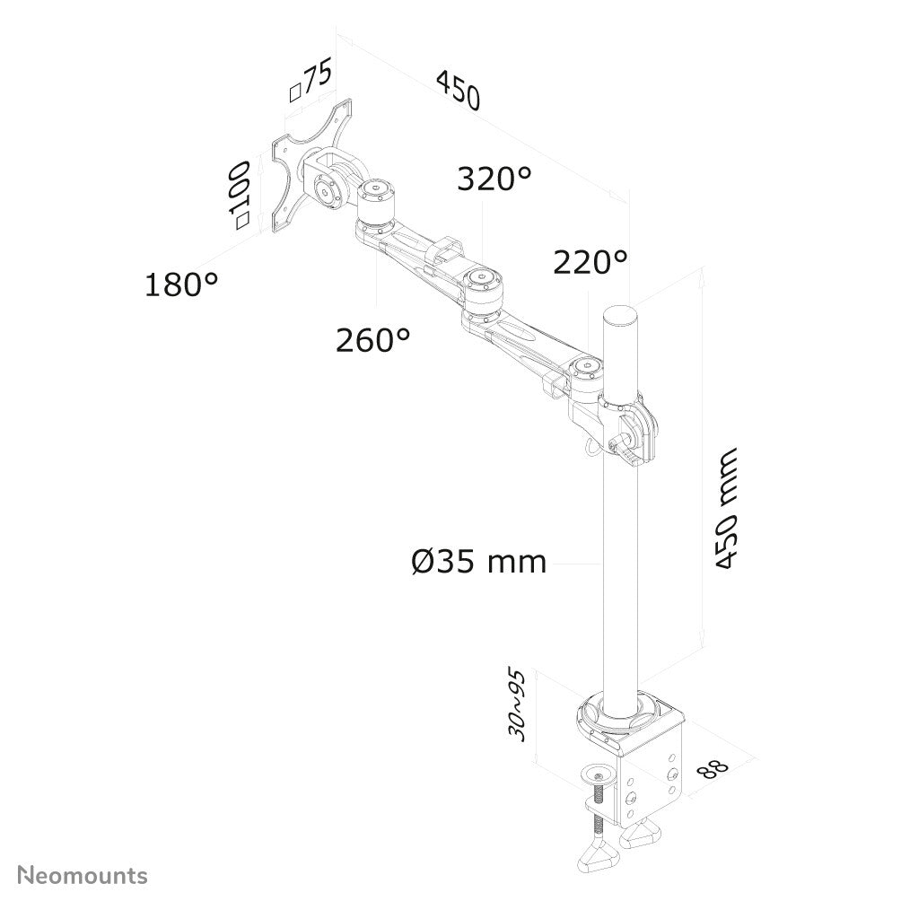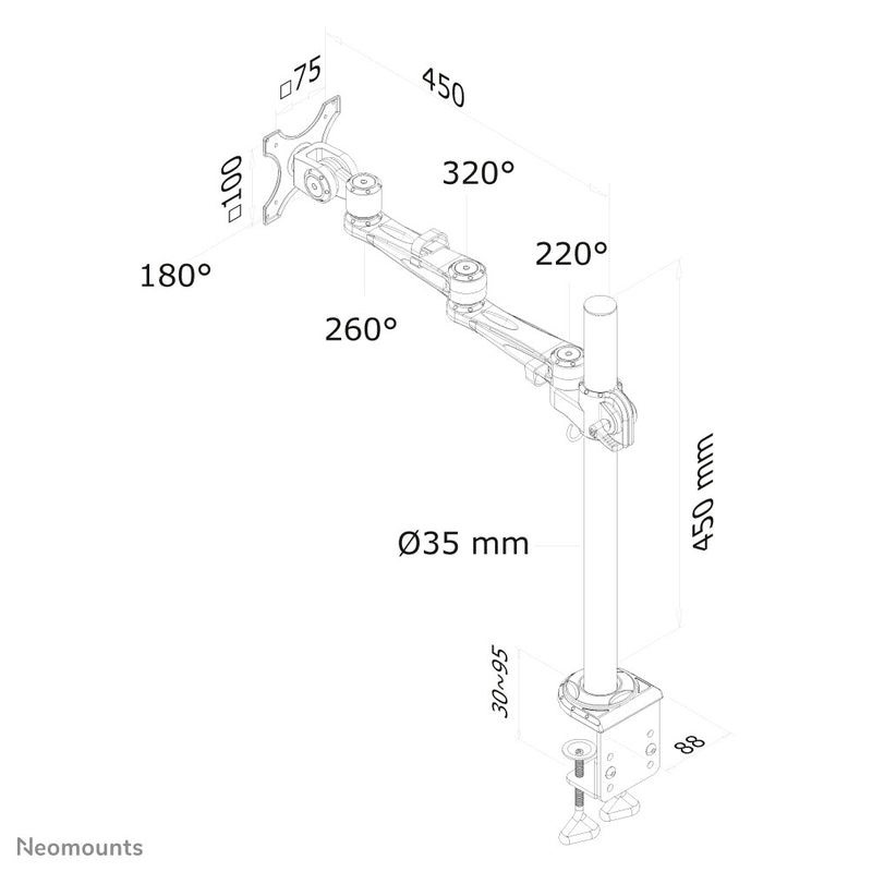 Neomounts by Newstar monitor desk mount. Mounting: Clamp, Maximum weight capacity: 10 kg, Minimum screen size: 25.4 cm (10"), Maximum screen size: 76.2 cm (30"), Minimum VESA mount: 75 x 75 mm, Maximum VESA mount: 100 x 100 mm. Height adjustment, Tilt angle range: 0 - 180°. Product colour: Silver