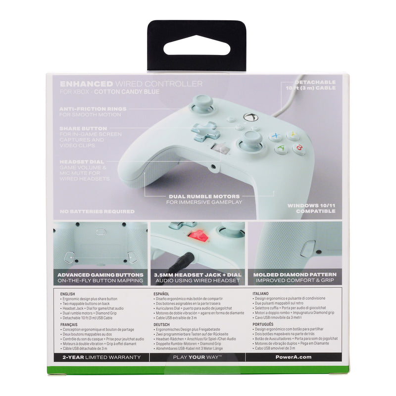 Take your game to new levels with the PowerA Enhanced Wired Controller for Xbox Series X|S. This Cotton Candy Blue controller is a sweet addition to any Xbox setup. Officially licensed by Xbox, it also features two mappable Advanced Gaming Buttons you can program quickly, mid-action. Experience truly immersive gaming with Dual Rumble Motors, a 3.5mm stereo audio jack, and quick-response Headset Dial with volume control and one-touch Mic Mute.