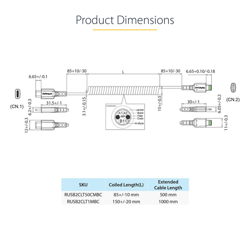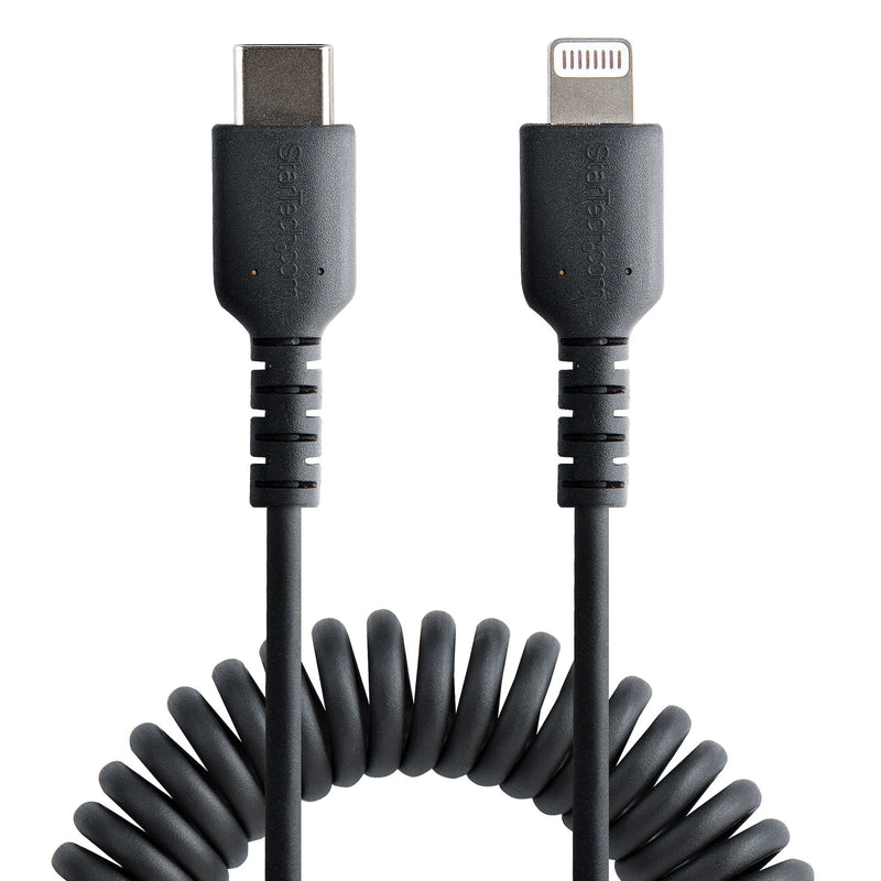 50cm/20in USB C to Lightning Cable, MFi Certified CableThis coiled Lightning to USB C cable can withstand the daily demands of charging and syncing your mobile devices. It contracts to 1ft (32cm) making it compact and convenient to store.Built for Daily UseThe durable Lightning charging cable has aramid fiber reinforcement that shelters it from the stress of frequent bends. This also lets the cable flex without over-stretching or damaging the core of the cable.Flexible Strain ReliefThe Lightning to USB-C cable is constructed to prevent the connector from separating from the jacket. The extra-long strain relief molding is tested to withstand over 5,000+ bend cycles at a 180° angle.Superior ConnectionThe durable cable supports all USB 2.0 specifications providing a dependable connection for all your Lightning devices. It is also Apple MFi certified which is guaranteed for fast and reliable charge and sync from USB-C charging ports.RUSB2CLT50CMBC is backed by a StarTech.com® 2-year warranty and free lifetime technical support.The StarTech.com Advantage