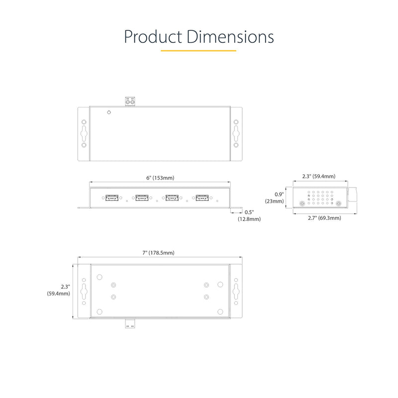 Connect four USB Type-A 3.2 Gen 1 (5Gbps) devices to a single USB port on your computer, using a USB hub that's suitable for harsh industrial/commercial environmentsIncrease USB scalability in industrial environments, product and repair labs, conference rooms or office workstations, using this 4-Port Industrial USB Hub.Functional in Harsh EnvironmentsThis industrial USB hub delivers reliable performance in harsh environments with its heavy-duty, metal housing. It supports 5-24V DC terminal block input, giving you the flexibility to power the hub as required, based on your own power input options.Perfect for factory environments, the rugged hub features ESD/surge protection to each USB port, which aids in preventing damage to any connected devices.Mount to a Wall, Desk or DIN-RailInstall the hub where it's best suited for your application. Securely mount the hub to a variety of surfaces, including a wall, desk, or rack, using the built-in mounting brackets and included hardware.Connect and Charge USB DevicesDesigned for a high volume of connections, this robust USB 3.0 hub offers four connection ports, for connecting more USB devices/peripherals.The industrial USB hub supports DC and terminal block power inputs 5 to 24V DC that provide compatibility and flexibility in different scenarios such as product and repair labs, conference rooms, or office workstations.StarTech.com offers external power adapters, ITB20D3250 and SVA12M5NA, sold separately.With the optional power adapter, the hub supports USB battery charging specification 1.2, delivering up to 2.4A on any port to a maximum of 30W total, so you can charge your mobile devices faster than traditional USB ports allow.Wide Device CompatibilityThe hub is OS independent ensuring support on a wide range of platforms including Windows, macOS and Linux.5G4AINDNP-USB-A-HUB is backed by a StarTech.com 2-year warranty and free lifetime 24/5 multi-lingual technical support. StarTech.com has been the IT professionals' choice for over 30 years.The StarTech.com Advantage
