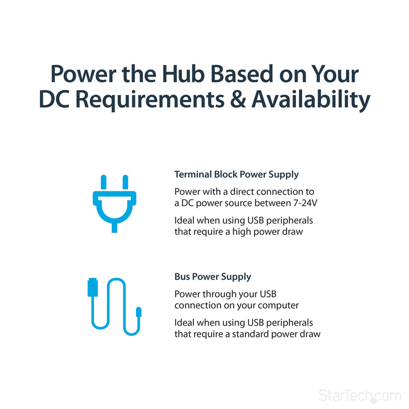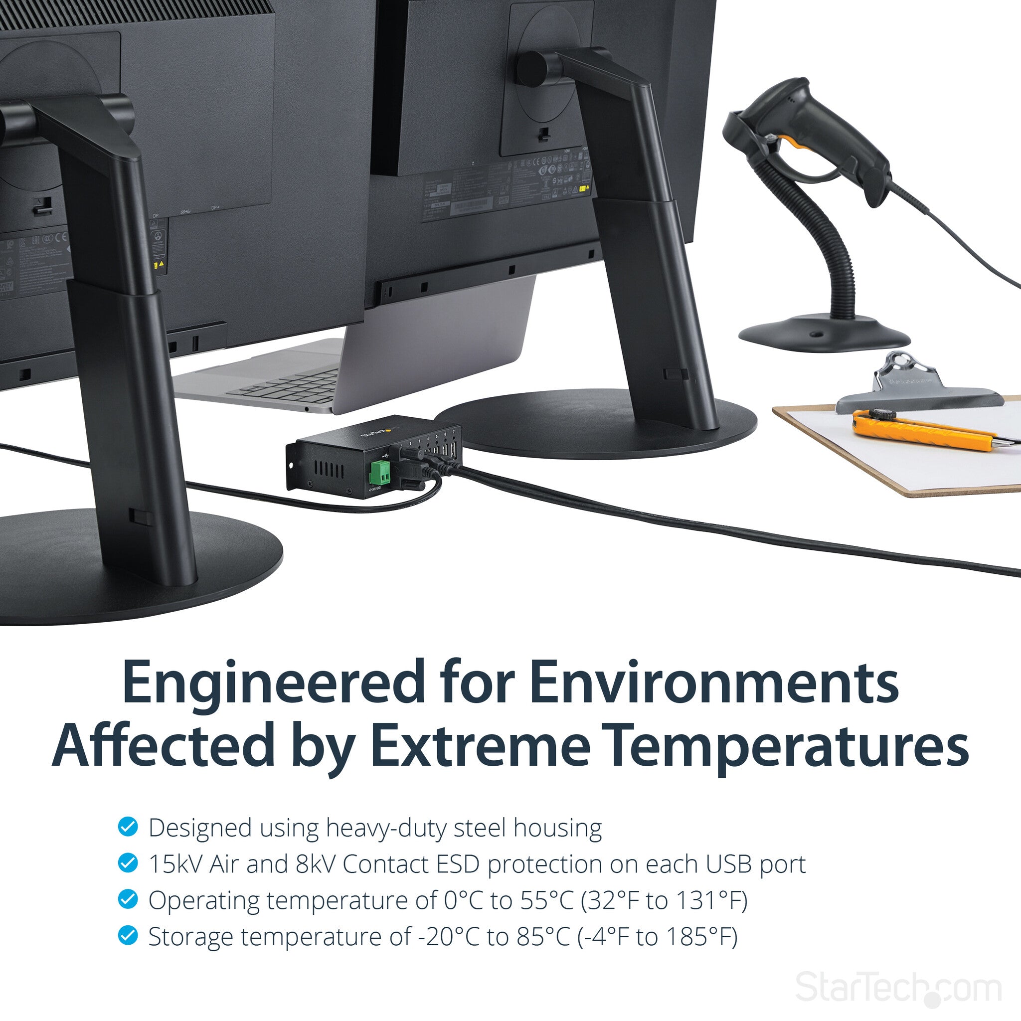 Industrial Grade | 15kV Air | 8kV Contact | Metal | Mountable | DIN Rail | 480 MbpsThis TAA compliant 7-port industrial USB 2.0 hub gives you the scalability you need in harsh industrial environments, product and repair labs, conference rooms or office workstations. With its rugged industrial grade metal housing, it is designed to meet the advanced requirements of connecting a high number of devices in factories and office environments.Perfect for Harsh EnvironmentsThis industrial USB hub delivers reliable performance with a metal, heavy-duty housing. It supports wide-range 7-24V DC terminal block input, giving you the flexibility to power the hub as required, based on your own power input capabilities.Perfect for factory environments, the rugged hub also supports a wide operating temperature range (0°C to 55°C) and offers surge and ESD protection to each USB port, which can help prevent damage to your connected devices.Connect More USB DevicesDesigned for a high volume of connections, this robust USB 2.0 hub offers 7 connection ports, for connecting more USB devices and peripherals.Locate the Hub Where You Need It MostWith versatile installation options, you can install the hub where it’s best suited for your environment. With built-in mounting brackets and included DIN mount rails, you can securely mount the USB 2.0 hub to most surfaces such as a wall, under a desk or rack.StarTech.com offers an external power adapter, ITB20D3250, sold separately. The universal DC power adapter can be used as an alternative, back up or replacement power supply for StarTech.com’s line of industrial USB hubs.Works with Older USB DevicesThe rugged USB hub supports the full 480 Mbps bandwidth of USB 2.0 and is backward compatible with previous USB devices.The ST7200USBM is backed by a StarTech.com 2-year warranty and free lifetime technical support.The StarTech.com Advantage