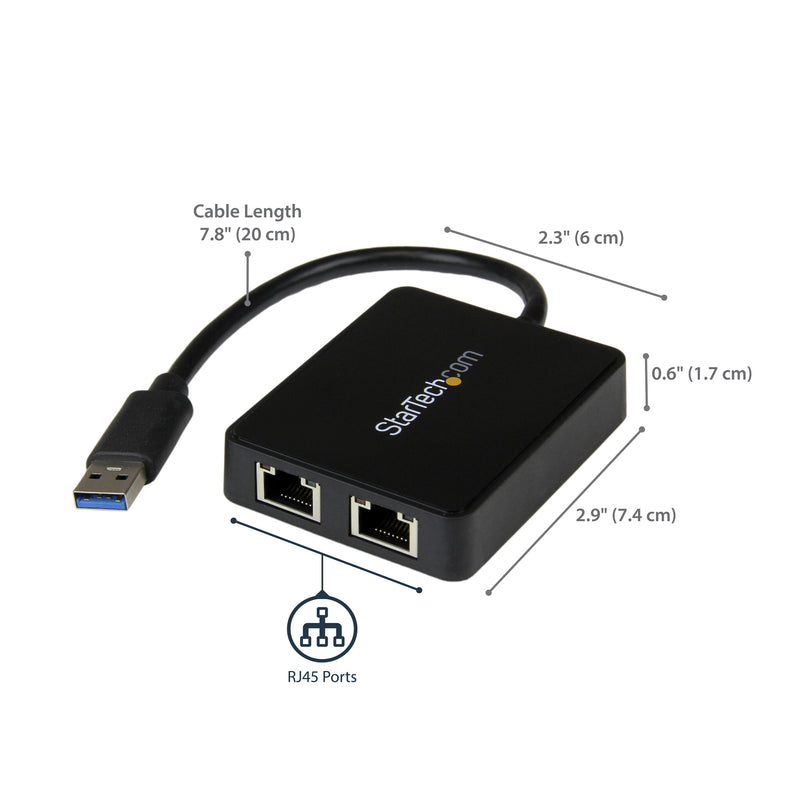 This 2-port USB LAN adapter is a versatile solution for connecting to two separate physical networks simultaneously, leveraging the 5 Gbps speed of USB 3.0 to provide dedicated gigabit bandwidth to each port. The dual USB NIC is also ideal for providing dedicated physical network interfaces to virtual machine configurations. Great for IT administrators that require dual-homed or multi-homed host systems.