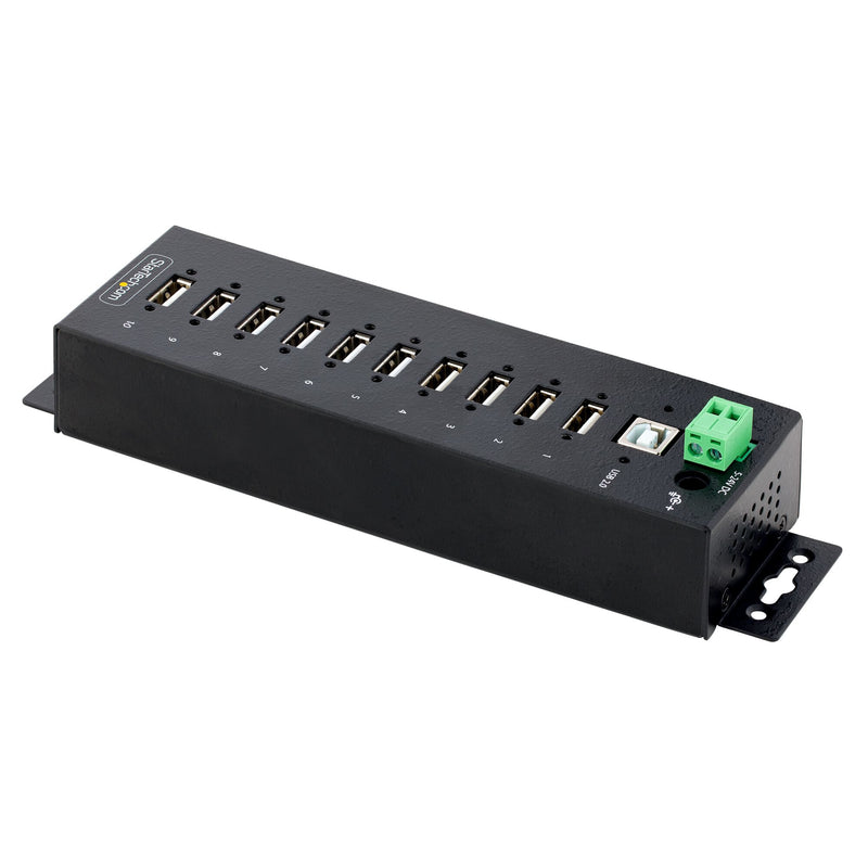 Metal Construction | 6ft (1.8m) USB Host Cable IncludedThis TAA-compliant 10-port industrial USB 2.0 Hub delivers scalability and protection in harsh industrial environments by providing a high number of USB ports with ESD level 4 protection. The durable metal housing construction is ideal for industrial applications. For power connectivity, the Hub features power redundancy using the DC barrel plug and terminal block port. Finish the installation by mounting the Hub to a DIN rail using the included hardware or on a desk or wall with the built-in mounting brackets.Rugged ConstructionThis industrial USB 2.0 Hub delivers reliable performance in the most challenging conditions where operating temperatures range from 32 to 140°F (0 to 60°C) at 95% relative humidity.The ESD level 4 protection (15kV air and 8kV contact) ensures your equipment is protected from electrostatic damage. An external power source is required, 5 to 24V DC. Optionally, StarTech.com offers part ITB20D3250 to power the Hub via the 2-wire terminal block port.Connect 10 USB Type-A USB DevicesThe USB Hub features screw-lock USB ports for the upstream and downstream connections to prevent accidental disconnects. Driverless installation and OS-independent speed up any deployment ensuring little downtime and compatibility with many USB peripherals.The rugged USB Hub supports 480Mbps total bandwidth of USB 2.0 and is backward compatible with USB 1.1 and 1.0 devices.CompatibilityThe installation options include DIN rail mounting dual-bracket horizontal or single-bracket vertical and wall or desk mounting using the integrated mounting brackets. To finish the installation, the Hub includes a 6ft (1.8m) USB cable with screw-lock to prevent accidental disconnects during operation.The industrial USB hub is USB 2.0 compliant and supports DC and terminal block power inputs 5 to 24V DC that provide compatibility and flexibility in different scenarios such as product and repair labs, conference rooms, or office workstations.The 10-port Industrial Hub is backed for 2-years, including free lifetime 24/5 multi-lingual technical assistance.The StarTech.com Advantage
