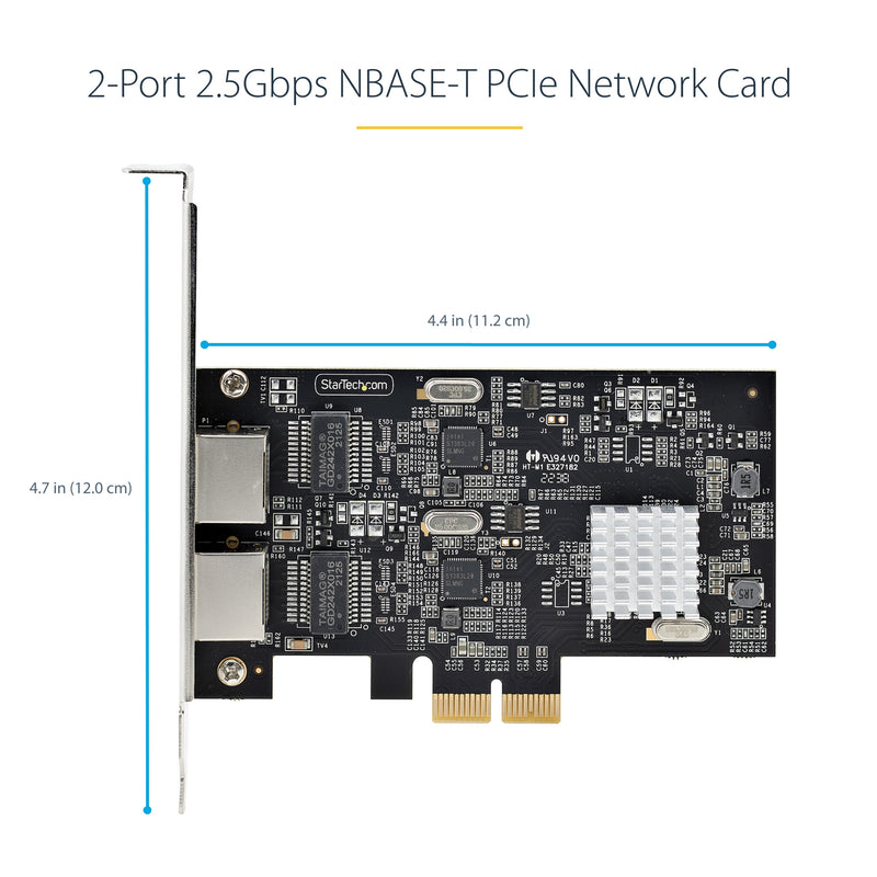 Dual-port PCIe network card with Intel® I225-V chip features multi-Gigabit speeds with NBASE-T supportThis dual-port 2.5GbE network interface card (NIC) features independent Intel I225-V chipsets for each port with Intel vPro technology, to enhance performance and data integrity across two 2.5G ethernet connections. The variable multispeed options (2.5/1Gbps and 100/10Mbps) enable support for both new and legacy network hardware. Utilize existing Cat5e or CAT6 cabling infrastructure while adding NBASE-T (802.3bz) compatibility for seamless integration.Increased Network SpeedThe PCIe network card leverages Intel vPro technology for remote management and troubleshooting capabilities. Improve bandwidth for data-intensive applications, network sharing, FTPs, online or local storage/backup, and the streaming of online content - while reducing network slowdowns. Access up to 2.5GBASE-T speeds using Cat5e (or better) cabling, to maximize existing networks and equipment. To ensure reliable performance, two Intel I225-V chipsets are used, providing independent Ethernet controllers to each port.Enhance Existing HardwareThe network interface card connects via an available x2 PCI Express 2.0 (or higher) expansion slot. The card ships in a standard-profile bracket and includes a low-profile bracket for installation into small form factor systems and servers. This ethernet NIC card is compatible with Windows, Windows Server, VMware, and Linux.This card supports the following advanced features: PXE Boot, WoL, VLAN tagging, 9 K jumbo frame, full-duplex, and Intel vPro technology.The StarTech.com Advantage