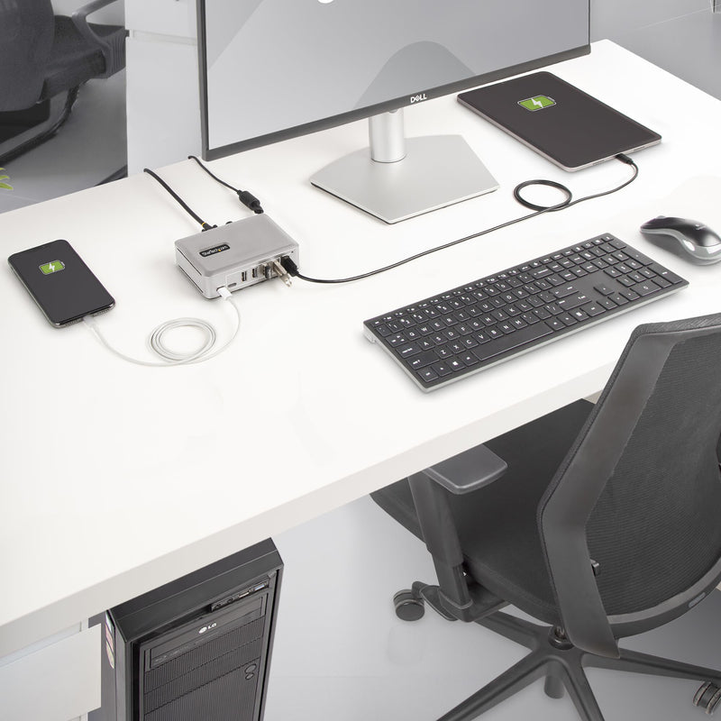 Add 5x USB-A and 2x USB-C ports to a USB-C enabled Desktop/LaptopAdd seven USB 3.2 Gen 2 (10Gbps) ports (5x USB-A, 2x USB-C) to a USB-C computer using this 7-Port USB-C Hub. The USB Hub is self-powered with an included power adapter. The USB Hub features Overcurrent Protection (OCP). OCP aids in preventing peripherals from overdrawing power, avoiding USB device dropouts, and the computers from shutting down unexpectedly. Support for Wake On USB enables USB communications, from devices connected to the hub, to take the computer out of standby or other power saving/sleep modes.High Performance USB 3.2 Gen 2 (10Gbps) HubThe USB Hub shares 10Gbps from the USB host device, enabling high-speed data transfers for high-performance applications. The USB hub is backward compatible with previous USB versions, including USB 3.2 Gen 1 (5Gpbs), USB 2.0 (480Mbps), and USB 1.1 (12Mbps). It features five USB-A ports and two USB-C ports. This combination of ports enables support for a wide range of modern and legacy USB devices, such as external storage devices (e.g., thumb drives, HDDs/SSDs), HD Cameras (e.g., webcams), mice, keyboards, and USB headsets.Power and Charge USB DevicesThe USB hub is self-powered, using the 65W power adapter. The hub features two USB BC 1.2 ports (1x USB-A, 1x USB-C), each providing 2.4A (12W) of power simultaneously, making it ideal to charge battery powered USB devices like smartphones, and tablets, while also providing a data connection. These ports will provide power with or without a host computer connected, with support for both CDP (Charging Downstream Port) & DCP (Dedicated Charging Port) applications. The hub features four USB-A, and one USB-C port that each provide the USB 3.2 standard of 0.9A (4.5W) of power. The included power adapter ensures that all ports will always provide specified power regardless of how many devices are connected.USB-IF Certified Host CableA high-quality USB-IF certified USB-C host cable is included. The cable features a screw-locking, connector to ensure a secure and reliable connection to the USB hub. The Thermoplastic Elastomer (TPE) cable jacket is softer and more flexible than PVC jacketed cables.Plug-and-Play InstallationThe 7-Port USB Hub is OS independent supporting all operating systems, including Windows, macOS, ChromeOS, iPadOS and Android. Installation is automatic upon connection to a host computer.Mount the USB Hub to a wall, desk, or VESA mount, using StarTech.com hub mounts: SSPMSVESA or SSPMSUDWM.Enhance Productivity and Device Management with the StarTech.com Connectivity Tools ApplicationDeveloped to improve performance and security, StarTech.com Connectivity Tools is the only software suite on the market that is compatible with a wide variety of IT connectivity accessories. The applicable software for this product is the USB Event Monitoring Utility. Use this utility to track and log any connected USB devices.For more information and to download the StarTech.com Connectivity Tools application, please visit: www.StarTech.com/connectivity-toolsThis product is backed for 2-years by StarTech.com, including free lifetime 24/5 multi-lingual technical assistance.The StarTech.com Advantage